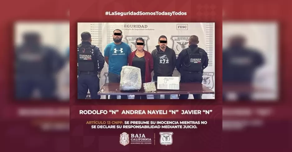 Al ser cuestionados sobre la posible posesión de narcóticos, ninguno de los tres respondió, por lo que se les solicitó descender del vehículo para realizar una revisión preventiva. Durante la inspección, los oficiales adscritos a la Secretaría de Seguridad Ciudadana de Baja California (SSCBC) aseguraron un arma de fuego tipo pistola con un cargador abastecido con 06 cartuchos útiles de calibre .9 mm, dos chalecos tácticos antibalas y 06 bolsas con marihuana, cuyo peso aproximado fue de 19 gramos.