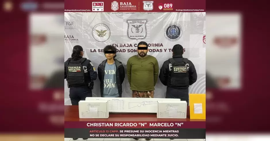 Derivado del hallazgo, Marcelo "N" y Christian Ricardo "N" fueron inmovilizados con candados de mano y posteriormente los trasladaron a la ciudad de Ensenada, donde quedaron a disposición de la Fiscalía General de la República (FGR). La Seguridad Somos Todas y Todos.