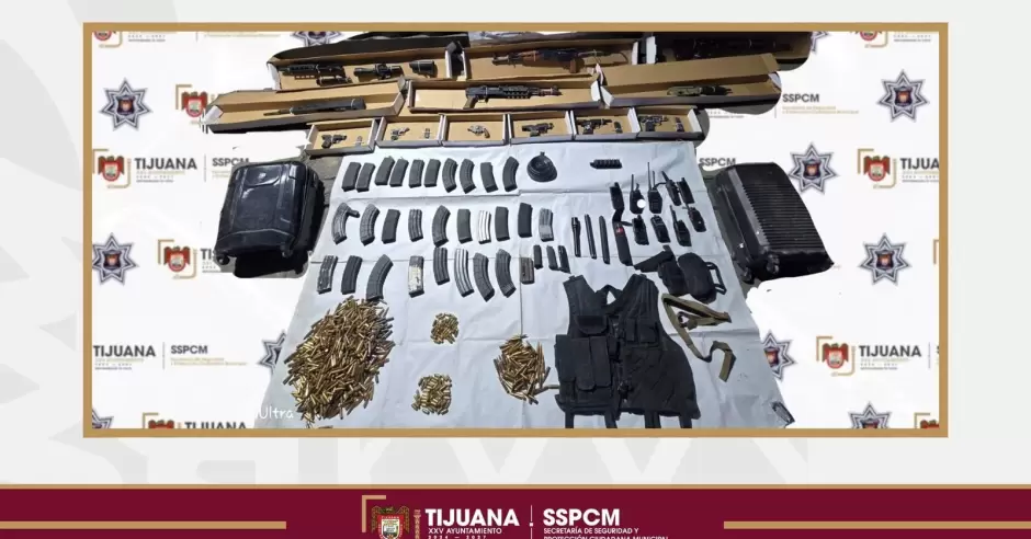 Tijuana.- La Secretaría de Seguridad y Protección Ciudadana Municipal (SSPCM) de Tijuana aseguró 11 armas de fuego, 33 cargadores y 495 cartuchos útiles de diversos calibres, además de ocho radiocomunicadores, un chaleco antibalas y diverso equipo relacionado con armamento.