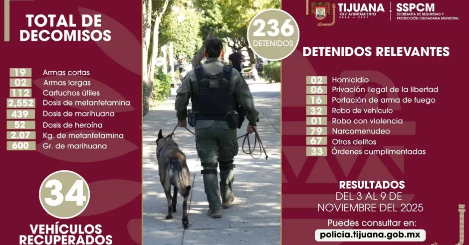 TIJUANA.- La Secretaría de Seguridad y Protección Ciudadana Municipal (SSPCM), aseguró a 236 personas y logró la recuperación de 21 armas de fuego durante el periodo del 3 al 9 de noviembre, como resultado de diversas acciones en el marco de la recuperación de la paz y la seguridad de Tijuana.