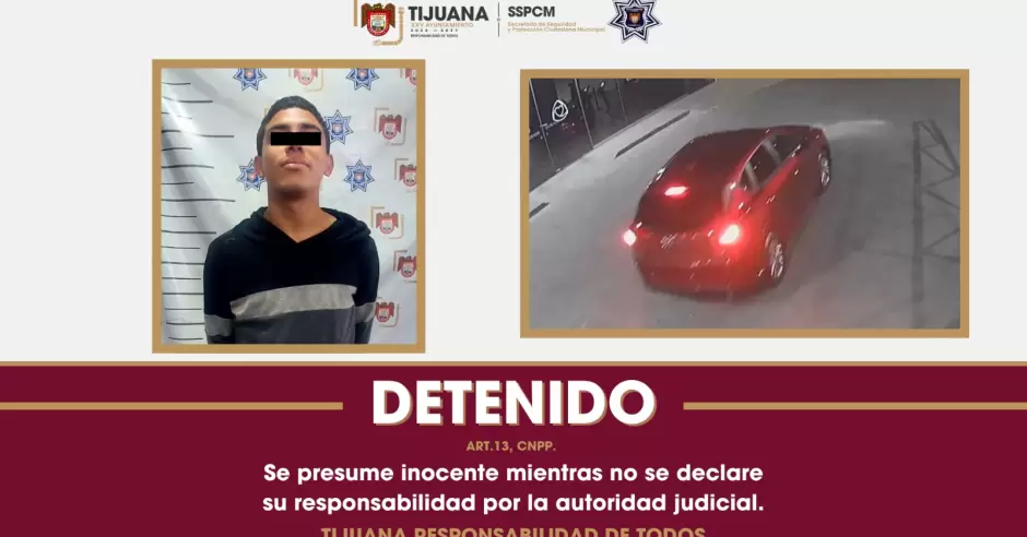 TIJUANA.- La Secretaría de Seguridad y Protección Ciudadana Municipal (SSPCM) confirmó la captura de un individuo señalado como el presunto responsable de haber sustraído un vehículo en las primeras horas del miércoles 14 de enero en una agencia de autos situada en la colonia Fortín de las Flores.
