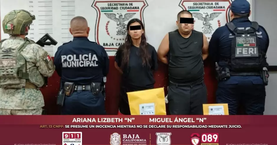En Mexicali, durante un operativo en el fraccionamiento Valle de Puebla, en coordinación con la Dirección de Seguridad Pública Municipal (DSPM) y la Secretaría de la Defensa Nacional (Defensa), detuvo a Ariana Lizbeth "N", de 20 años, y Miguel Ángel "N", de 26 años, en posesión de 81 bolsas con hierba verde similar a la marihuana, con un peso aproximado de 276 gramos, así como 20 bolsas con una sustancia parecida a la metanfetamina, con aproximadamente 14 gramos.