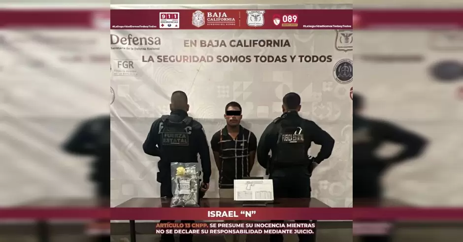Los agentes estatales dieron alcance al individuo, quien se identificó como Israel "N", de 23 años, originario de Tijuana. Al informarle el motivo de la intervención, se le practicó una revisión precautoria, localizando a la altura de la cintura un arma de fuego tipo pistola, color negro, abastecida con 14 cartuchos calibre 9mm.