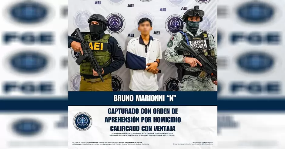 TIJUANA.- Elementos de la Agencia Estatal de Investigación, adscritos a la Unidad Especializada en Delitos Contra la Vida de la Fiscalía General del Estado de Baja California, cumplimentaron una orden de aprehensión en contra de Bruno Marionni "N", alias "El Bruno", por su presunta responsabilidad en el delito de homicidio calificado con ventaja.