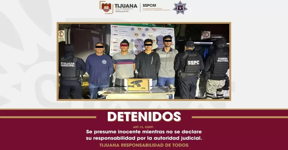 TIJUANA.- En una exitosa coordinación entre la Secretaría de Seguridad y Protección Ciudadana (SSPCM), la Secretaría de Seguridad y Protección Ciudadana Federal (SSPCF) y la Guardia Nacional, se logró la detención de cuatro individuos por la portación ilegal de arma de fuego, de los cuales se presume que, al menos, uno de ellos está relacionado con el homicidio del propietario de Saldos Max.