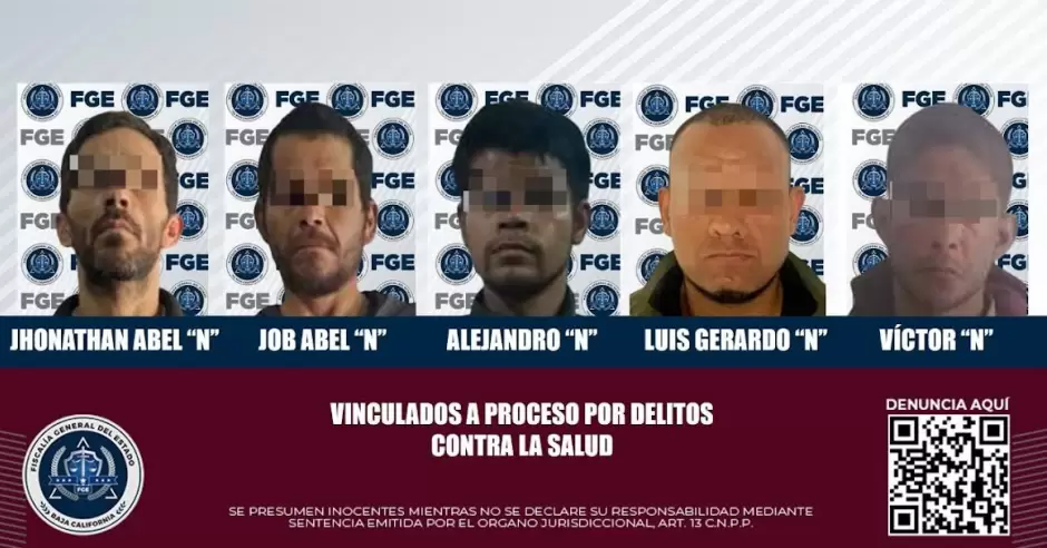 TIJUANA.- La Fiscalía General del Estado informa que, cinco imputados por delitos contra la salud en la modalidad de narcomenudeo, fueron vinculados a proceso penal, luego de que el Ministerio Público presentó los elementos de prueba para que los jueces de control determinaran iniciar procesos en su contra.