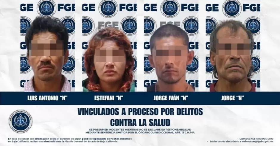 TIJUANA.- La Fiscalía General del Estado informa que cuatro imputados por delitos contra la salud en la modalidad de narcomenudeo, fueron vinculados a proceso penal, luego de que los elementos de prueba presentados por el Ministerio Público fueron suficientes para que los jueces de control determinaran iniciar el proceso en su contra.