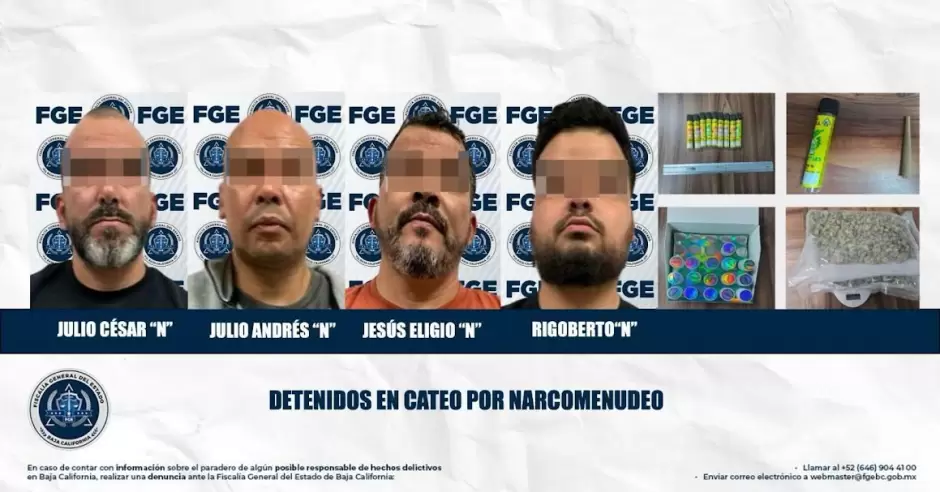 PLAYAS DE ROSARITO. - La Fiscalía General del Estado, a través de la Fiscalía Especializada en Narcomenudeo, llevó a cabo un cateo en una negociación ubicada en la Plaza Comercial Oceana, resultando en la detención de cuatro individuos bajo sospecha de venta de drogas en el lugar.