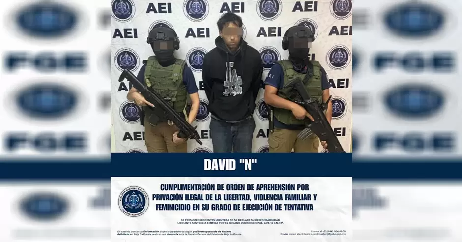 TIJUANA.- Por instrucciones de la fiscal general del Estado, Dra. Ma. Elena Andrade Ramírez, agentes estatales de investigación adscritos a la Unidad de Violencia Familiar cumplimentaron una orden de aprehensión en contra de David "N", por los delitos de privación ilegal de la libertad, violencia familiar y feminicidio en grado de tentativa.