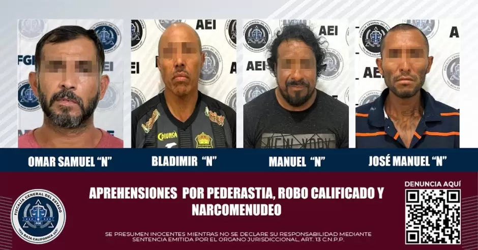 TIJUANA.- Elementos de la Agencia Estatal de Investigación (AEI), de la Fiscalía General del Estado (FGE), cumplimentaron en distintas acciones cuatro órdenes de aprehensión por los delitos de pederastia, robo calificado y narcomenudeo.