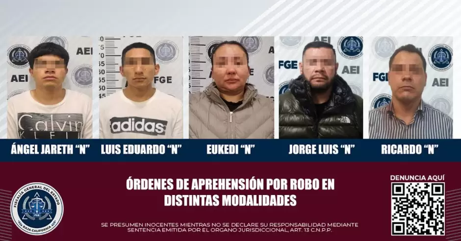 TIJUANA.- Como resultado de trabajos de campo y gabinete, elementos de la Agencia Estatal de Investigación (AEI) de la Fiscalía General del Estado llevaron a cabo la ejecución de cinco órdenes de aprehensión por el delito de robo en diversas modalidades. Las personas detenidas fueron presentadas ante la autoridad judicial que las requería.