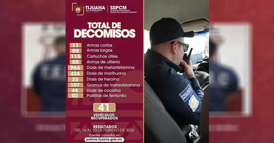 TIJUANA.- La Secretaría de Seguridad y Protección Ciudadana Municipal (SSPCM) llevó a cabo un operativo que resultó en el decomiso de 16 armas de fuego y diversas cantidades de sustancias prohibidas, como parte de las acciones preventivas realizadas del 16 al 20 de febrero. En la estrategia de seguridad que supervisa de manera permanente el presidente municipal de Tijuana, Ismael Burgueño Ruiz.
