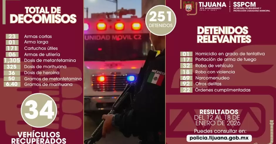 TIJUANA.- Como parte de las acciones que lleva a cabo la Secretaría de Seguridad y Protección Ciudadana Municipal (SSPCM) para la recuperación de la paz y el combate a la impunidad, durante la semana del 12 al 18 de enero se detuvo a 251 personas, se decomisaron 24 armas de fuego y se incautaron diversas sustancias prohibidas.