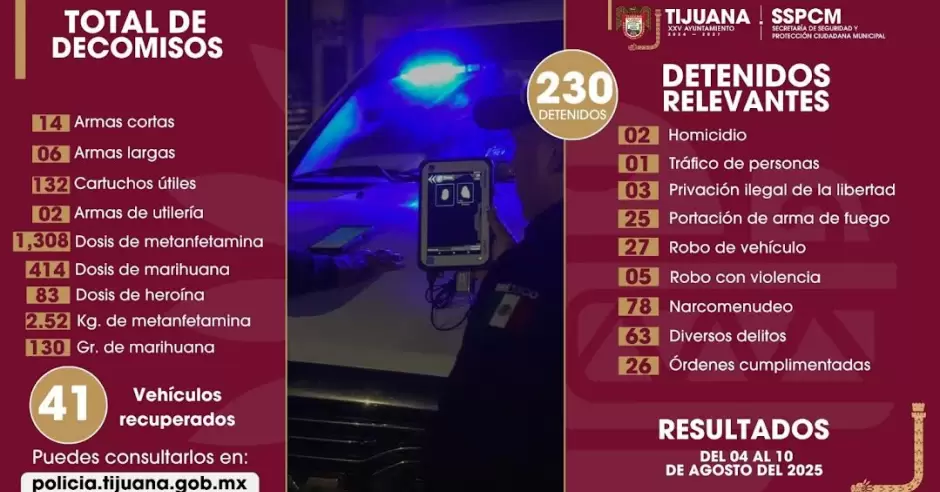 La Policía Municipal, en el periodo del 4 al 10 de agosto, también recuperó 41 vehículos que habían sido reportados como robados, los cuales pueden ser consultados en la página oficial de la Policía Municipal (policia.tijuana.gob.mx). Estos resultados son parte de un esfuerzo continuo por crear un entorno más seguro para todos los ciudadanos.