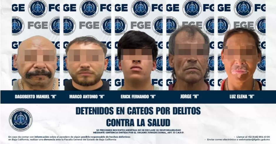 TIJUANA.- La Fiscalía General del Estado, a través de la Fiscalía Especializada en Narcomenudeo, informa que se llevaron a cabo diversos cateos en la ciudad de Tijuana y en Playas de Rosarito, resultado de los cuales fueron detenidas cinco personas por su probable responsabilidad en delitos contra la salud.