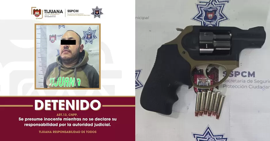 TIJUANA.- La Secretaría de Seguridad y Protección Ciudadana Municipal (SSPCM) informa que la tarde de este martes, agentes de la Policía Municipal detuvieron a Uriel "N", quien se desempeñaba como elemento de la Policía Comercial, por portación de un arma de fuego.