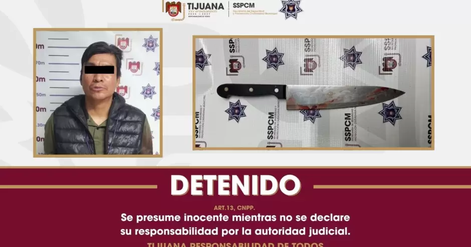 TIJUANA. Derivado de un reporte canalizado a través de la línea de emergencias 9-1-1, elementos de la Policía Municipal lograron la detención de un hombre señalado como presunto responsable de causar lesiones con un arma punzocortante a dos personas en el fraccionamiento Urbi Quintas del Cedro.