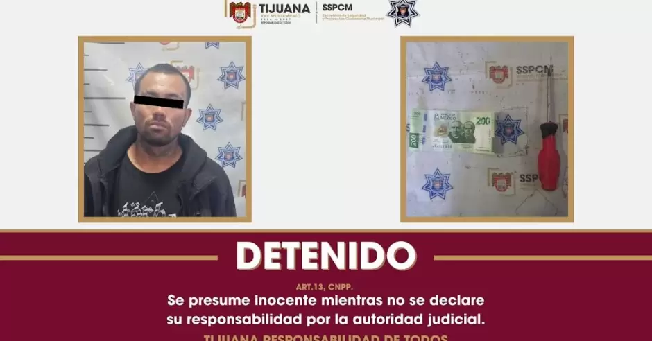 TIJUANA.- La Secretaría de Seguridad y Protección Ciudadana Municipal de Tijuana (SSPCM) detuvo, en la colonia Xochimilco, al presunto responsable de un asalto contra un transeúnte, como resultado de la pronta respuesta de elementos de la Policía Municipal ante un llamado de auxilio ciudadano.