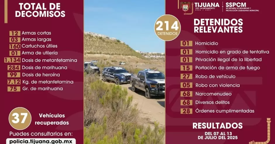 TIJUANA.- La Secretaría de Seguridad y Protección Ciudadana Municipal (SSPCM) informa que durante el periodo del 7 al 13 de julio, fueron aseguradas 214 personas como presuntos responsables de diversos delitos, así como la incautación de 15 armas de fuego.
