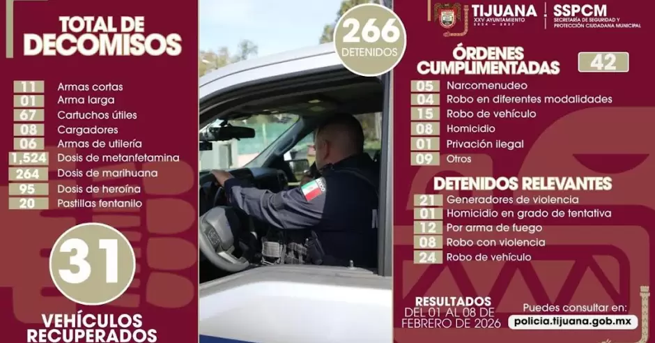 TIJUANA.- La Secretaría de Seguridad y Protección Ciudadana Municipal (SSPCM) informa que, durante el periodo del 1 al 8 de febrero, detuvo a 266 personas como presuntos responsables de diversos delitos y aseguró 12 armas de fuego, como parte de la estrategia de seguridad implementada por el presidente municipal de Tijuana, Ismael Burgueño Ruiz, la cual busca reforzar la tranquilidad y el orden en la ciudad.
