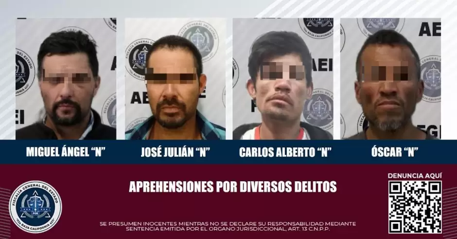 TIJUANA.- Cuatro hombres fueron puestos a disposición de jueces de control, una vez que fueron detenidos y se les cumplimentó la orden de aprehensión que pesaba en su contra, a través de diligencias llevadas a cabo por agentes estatales de investigación, informó la Fiscalía General del Estado (FGE).