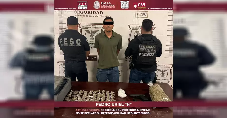 El aseguramiento tuvo lugar sobre la calle Alamán en la colonia Granjas Familiares. El individuo, identificado como Pedro Uriel "N", y originario de Tijuana, al percatarse de la presencia del convoy de seguridad se deshizo de una maleta de viaje y comenzó a correr para tratar de refugiarse en un domicilio.
