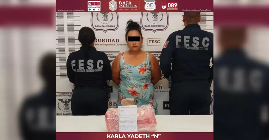 La mujer se identificó como Karla Yadeth "N" de 41 años y originaria de Ensenada, Baja California, a quien se le cuestionó si requería apoyo manifestando que no, sin embargo, al mostrar una actitud nerviosa se le solicitó descendiera del vehículo con el fin de llevare a cabo una inspección preventiva.
