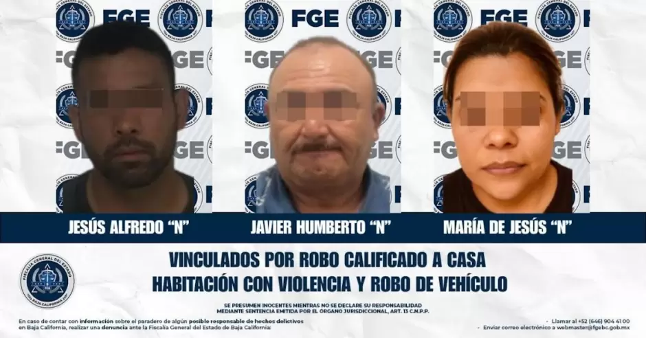 TECATE. - La Fiscalía General del Estado de Baja California, a través de la Unidad de Investigación Contra Robos de la Fiscalía Regional de Tecate, informa que se logró la vinculación a proceso de Javier Humberto "N", Jesús Alfredo "N" y María de Jesús "N", por su presunta participación en los delitos de robo calificado en casa habitación cometido de noche por dos o más personas en contra de personas mayores de 60 años de edad, ejecutado con violencia, así como robo de vehículo de motor ejecutado con violencia.