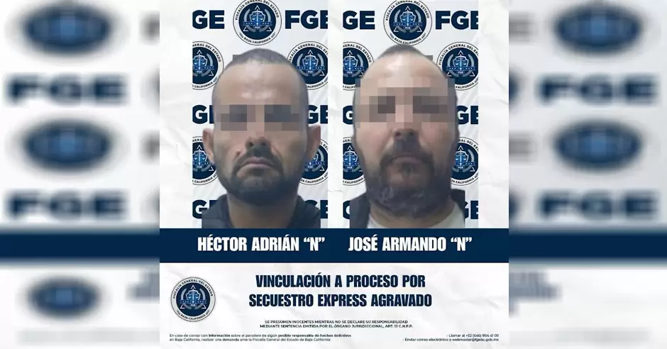 TIJUANA.- La Fiscalía General del Estado, a través de la Fiscalía Regional de Tijuana y su Unidad de Investigación con Detenido, obtuvo la vinculación a proceso en contra de Héctor Adrián "N" y José Armando "N", por su presunta responsabilidad en el delito de secuestro express agravado.