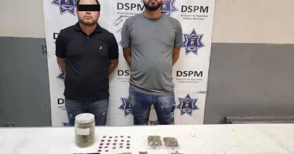 MEXICALI.- La Dirección de Seguridad Pública Municipal de Mexicali (DSPM), a través del despliegue de estrategias de contención de la violencia que conforman el operativo "Mexicali Seguro", logró la detención de Samuel de Jesús "N" de 29 años y José Luis "N" de 26 años, en posesión de un arma de fuego tipo pistola 9mm, así mismo, les fue asegurada marihuana además de envoltorios con metanfetaminas.