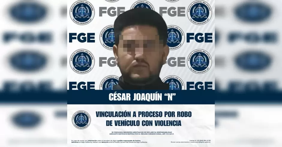 TIJUANA.- La Fiscalía Regional de Tijuana, a través de la Unidad de Investigación de Robo de Vehículos, obtuvo la vinculación a proceso penal de César Joaquín "N", por su probable responsabilidad en el delito de robo de vehículo con violencia.