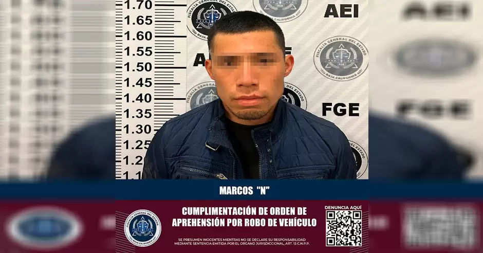 PLAYAS DE ROSARITO.- Por su presunta comisión en el delito que la ley señala como robo equiparado de vehículo de motor en su modalidad de uso de vehículo de motor robado, el de nombre Marcos "N", fue aprehendido tras labor desarrollada por efectivos de la Agencia Estatal de Investigación (AEI) de la Fiscalía General del Estado.