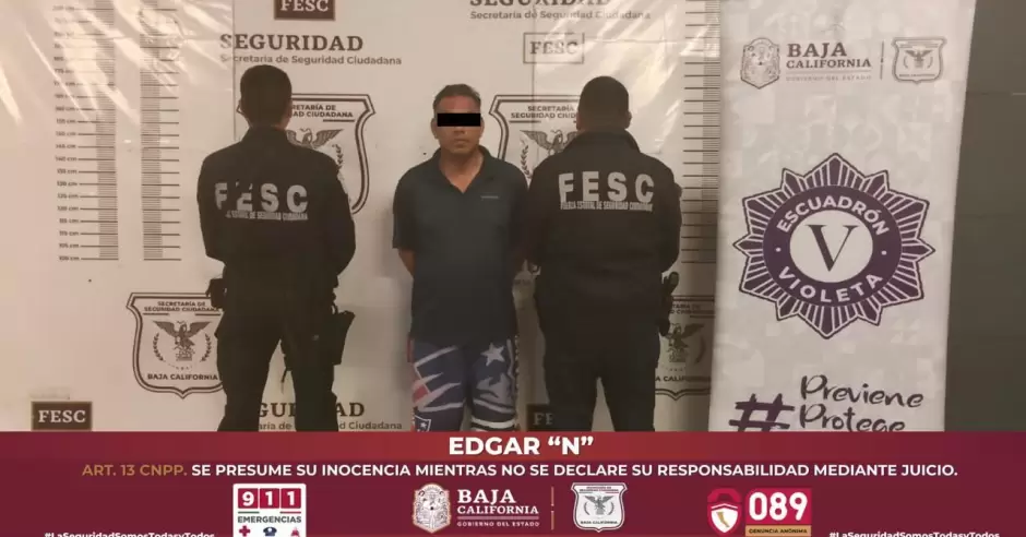 TIJUANA.- En atención a un reporte emitido a la línea de emergencias 9-1-1, elementos del Escuadrón Violeta de la Secretaría de Seguridad Ciudadana de Baja California (SSCBC) detuvieron a un hombre señalado por presuntamente agredir a su esposa e hija dentro de un domicilio ubicado en el fraccionamiento Paseos del Florido, en Tijuana.