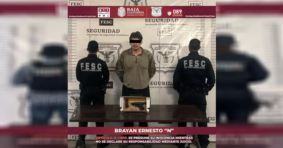 Los oficiales de la Fuerza Estatal de Seguridad Ciudadana (FESC) detectaron al conductor sobre la Vía Rápida Oriente y observaron que llevaba un objeto con características de un arma de fuego fajada a la altura de la cintura. Mediante código y sirena solicitaron que detuviera su marcha, logrando entrevistarse con el individuo, quien se identificó como Brayan Ernesto "N", de 25 años, originario de Tijuana.