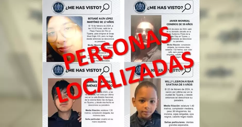 Las personas localizadas son: Betsabé Ailín López Martínez de 17 años, Bryan Martínez Jiménez de 13 años, Javier Monreal Cisneros de 59 años y Willy Lebrón Aybar Santana de 9 años de edad.