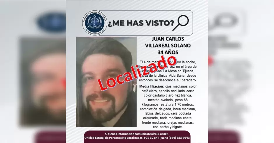TIJUANA.- La Fiscalía General de Baja California informa que ha sido localizado Juan Carlos Villareal Solano de 34 años de edad, quien se encuentra con buen estado de salud.