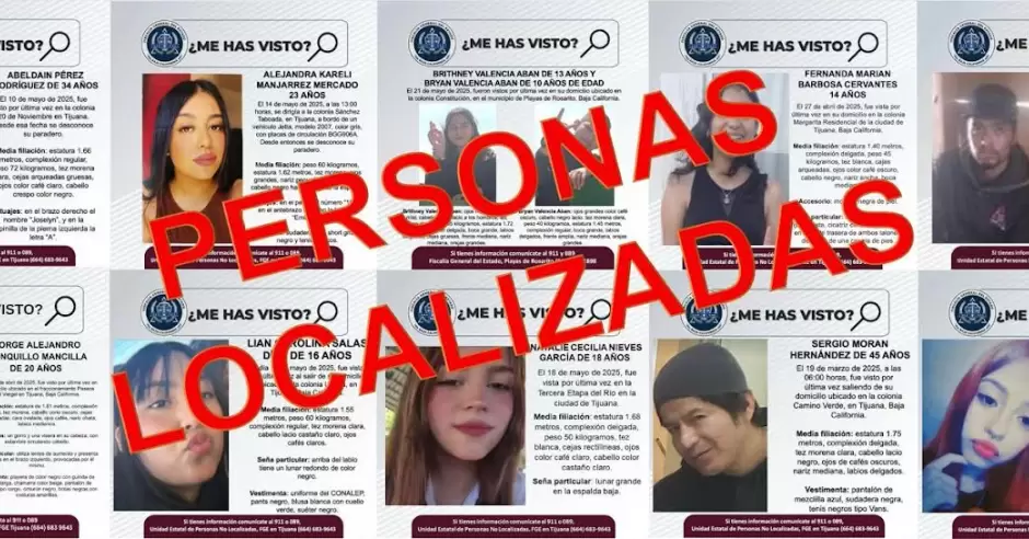 Las personas localizadas en diferentes acciones son: Abeldain Pérez Rodríguez, de 34 años; Alejandra Kareli Manjarrez Mercado, de 23 años; Brithney Valencia Aban, de 13 años; Bryan Valencia Aban, de 10 años; Fernanda Marian Barbosa Cervantes, de 14 años; Gerardo Cortéz Barragán, de 22 años; Jorge Alejandro Ronquillo Mancilla, de 20 años; Lian Carolina Salas Díaz, de 16 años; Natalie Cecilia Nieves García, de 18 años; Sergio Morán Hernández, de 45 años; y Silvia Litzy Eusebio Jacquez, de 15 años de edad.