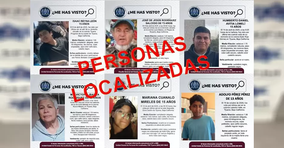Las personas localizadas son Isaac Reyna León de 15 años, José de Jesús Rodríguez Salcedo de 73 años, Humberto Daniel Avitia Lomelí de 15 años, Ma. Victoria Ibarra Rodríguez de 63 años, y Mariana Cuanalo Mireles de 15 años, y Adolfo Pérez Pérez de 13 años de edad.