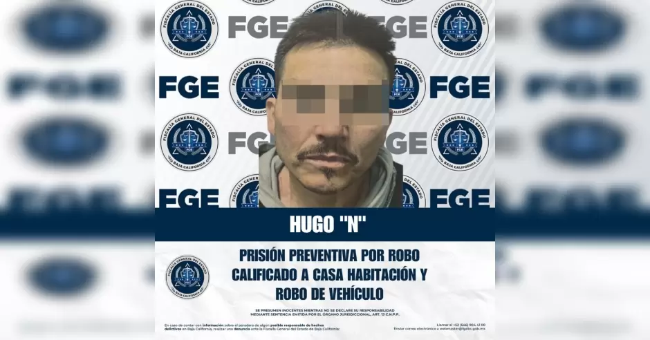 TIJUANA.- La Fiscalía Regional de Tijuana logró que se impusiera la medida cautelar de prisión preventiva a Hugo "N", por su presunta participación en los delitos de robo calificado a casa habitación con violencia y robo de vehículo con violencia. La resolución fue otorgada mientras continúan las investigaciones correspondientes a cargo del Ministerio Público.