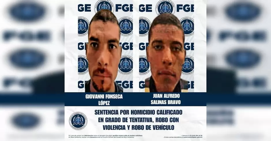 TIJUANA.- La Fiscalía Regional de Tijuana, a través de la Coordinación de Averiguaciones Previas y Control de Procesos, obtuvo sentencia condenatoria en contra de Giovanni Fonseca López alias "El Güero" y Juan Alfredo Salinas Bravo, responsables de los delitos de homicidio calificado en grado de tentativa, robo con violencia y robo de vehículo de motor.