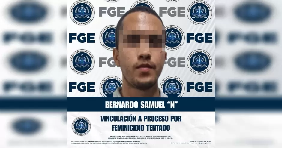 TIJUANA.- La Fiscalía Regional de Tijuana, a través de la Unidad de Investigación con Detenido, obtuvo la vinculación a proceso de Bernardo Samuel "N", por su presunta responsabilidad en el delito de feminicidio tentado.
