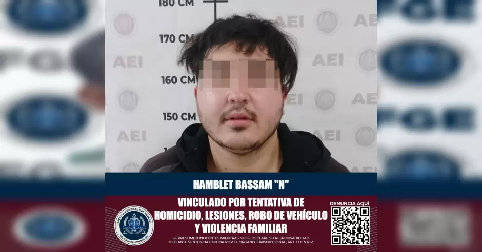 TIJUANA.- La Fiscalía General del Estado (FGE), a través de la Fiscalía Especializada en Delitos Contra las Mujeres Por Razón de Género dio a conocer que se logró la vinculación a proceso a Hamblet Bassam "N", a quien se le acusa por los delitos de homicidio calificado en su grado de ejecución de tentativa con ventaja, lesiones calificadas con ventaja, robo de vehículo y violencia familiar.