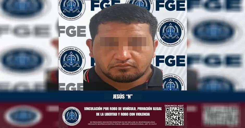 PLAYAS DE ROSARITO.- La Fiscalía General del Estado, a través de la Unidad Especializada en Delitos de Robo de Vehículos de la Fiscalía Regional de Playas de Rosarito, obtuvo la vinculación a proceso de Jesús "N", alias "El Chuy", por su presunta responsabilidad en los delitos de privación ilegal de la libertad, robo con violencia y robo de vehículo con violencia.
