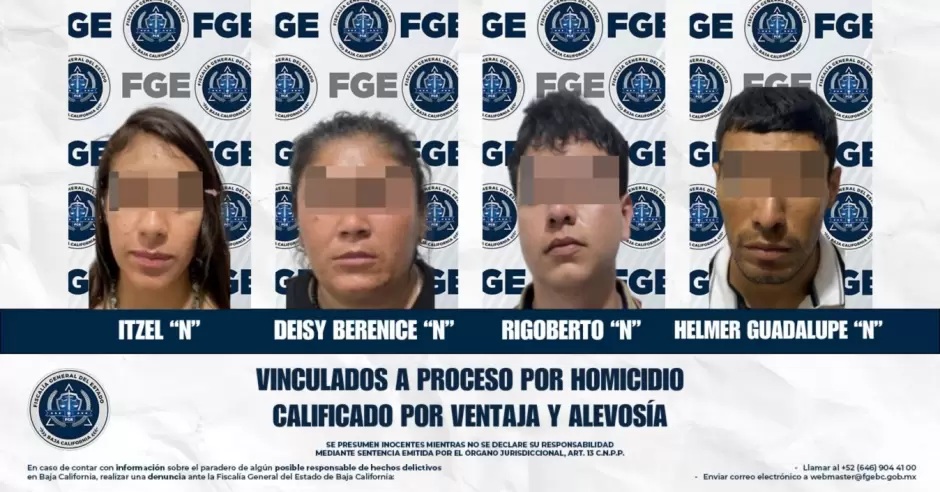 TIJUANA.- La Fiscalía General del Estado, bajo la dirección de la Dra. Ma. Elena Andrade Ramírez, informa que, gracias al trabajo constante de investigación que se realiza diariamente en esta institución, la Fiscalía Especializada en Delitos Contra la Vida ha logrado la vinculación a proceso de cuatro imputados por el delito de homicidio calificado con ventaja y alevosía.
