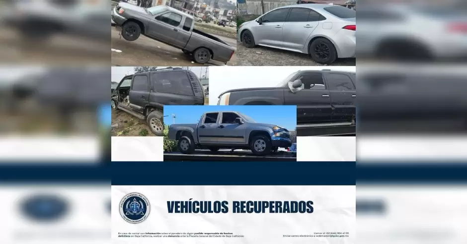 TIJUANA.- La Fiscalía Regional de Tijuana, a través de la Unidad de Investigación Especializada en Robo de Vehículos, informa que, del 19 al 25 de enero de 2026, se logró la recuperación en distintos puntos de la ciudad de 9 vehículos con reporte de robo, como resultado de labores de investigación y operativos estratégicos.