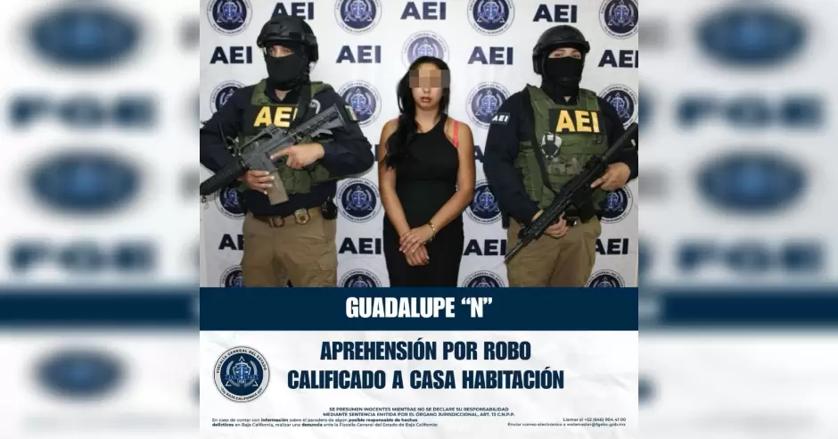 TIJUANA.- La Fiscalía General del Estado, a través de la Unidad de Aprehensiones de la Agencia Estatal de Investigación, detuvo a Guadalupe "N", por su presunta responsabilidad en el delito de robo calificado a casa habitación, derivado de los hechos ocurridos el pasado 14 de julio en la colonia Obrera II Sección, en esta ciudad.