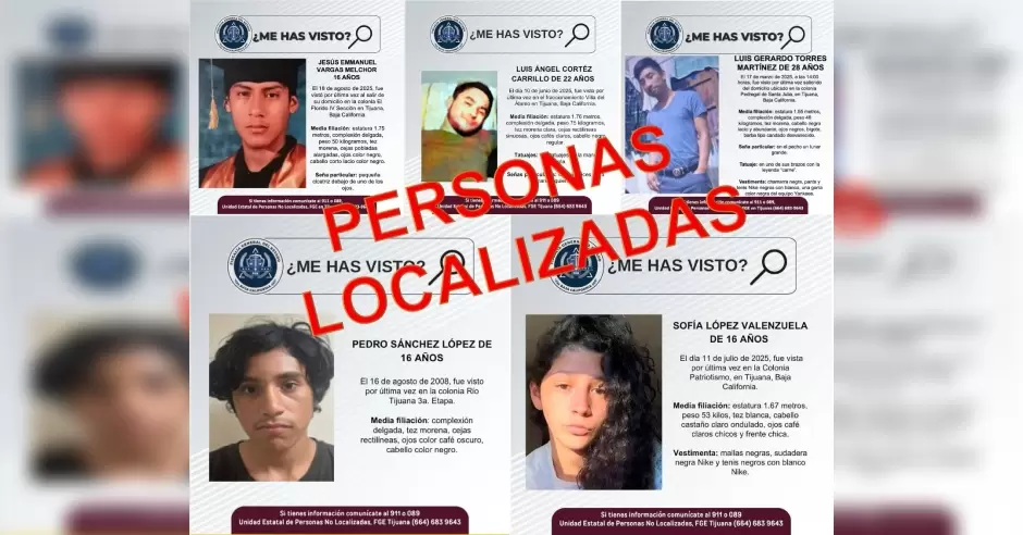Las personas localizadas son: Jesús Emmanuel Vargas Melchor, de 17 años; Luis Ángel Cortés Carrillo, de 22 años; Luis Gerardo Torres Martínez, de 28 años; Pedro Sánchez López, de 16 años; y Sofía López Valenzuela, de 16 años de edad.