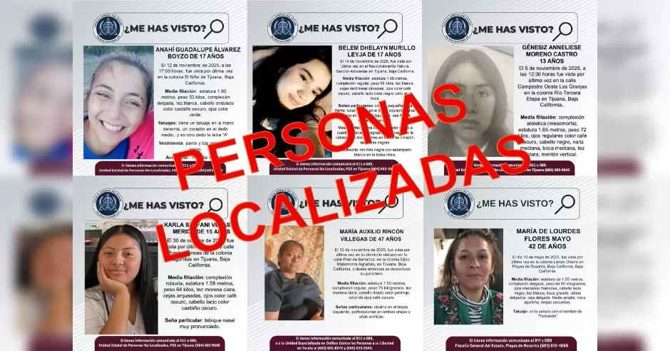 Las personas localizadas son: Anahí Guadalupe Álvarez Boyzo de 17 años, Belem Dhelayn Murillo Leyja de 17 años, Génesis Anneliese Moreno Castro de 13 años, Karla Stefani Velazco Merida de 15 años, María Auxilio Rincón Villegas de 47 años, y María de Lourdes Flores Mayo de 42 años de edad.