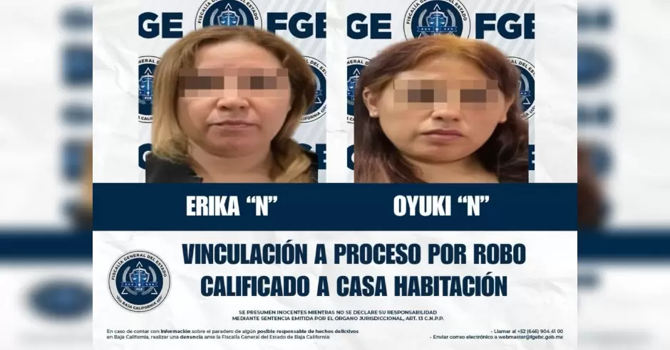 TIJUANA.- La Fiscalía Regional de Tijuana, a través de la Unidad de Investigación de Robos de la zona Mariano Matamoros, informa que se obtuvo la vinculación a proceso de dos mujeres, identificadas como Erika "N" y Oyuki "N", por su probable responsabilidad en el delito de robo calificado a casa habitación cometido por dos o más personas.