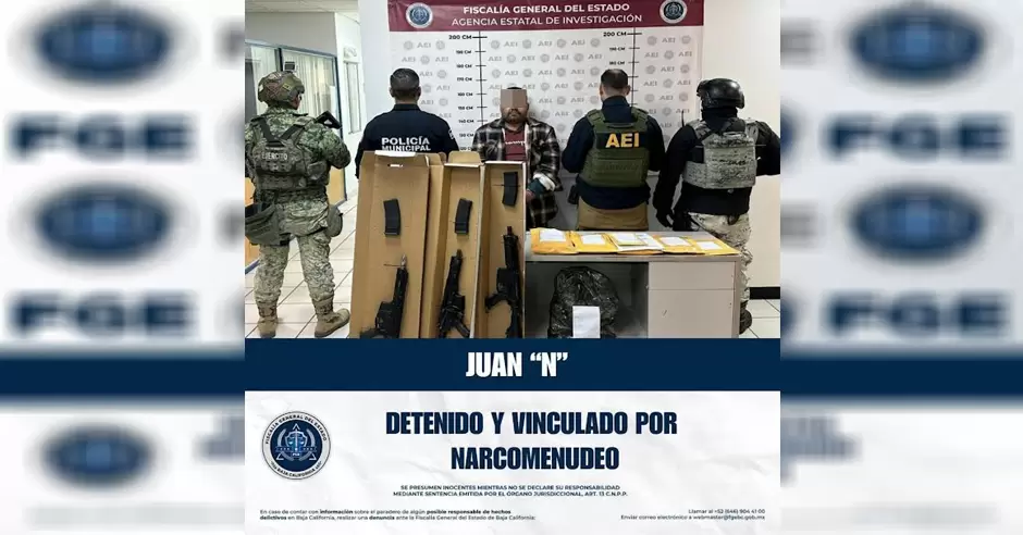 TECATE.- La Fiscalía Regional de Tecate informa que, mediante el trabajo coordinado de la Unidad de Investigación de Delitos con Detenido y la Agencia Estatal de Investigación, se logró la captura y vinculación a proceso de Juan "N" por los delitos contra la salud en la modalidad de narcomenudeo, en su variante de posesión de metanfetamina, así como por un delito del orden federal.